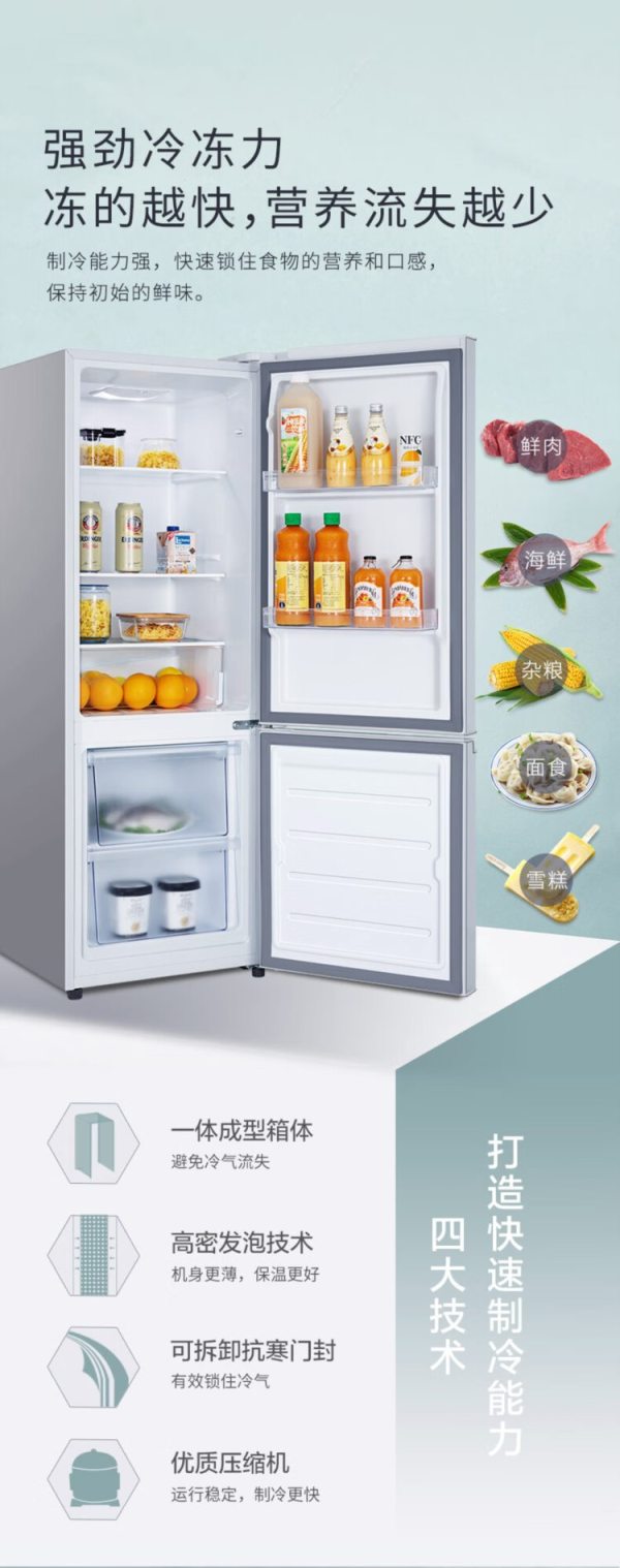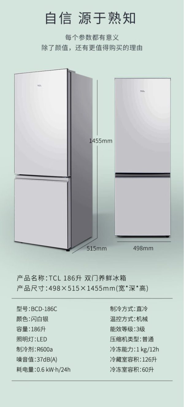 商品名称:TCL BCD-186C 186升 双门 冰箱 闪白银 (计价单位:台)