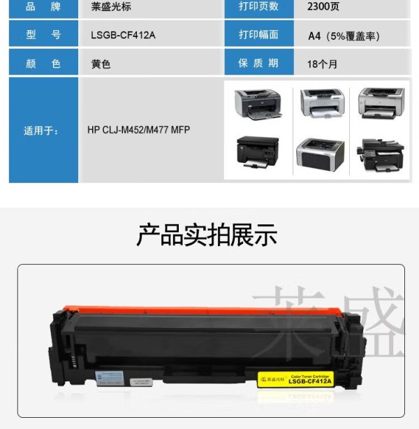 商品名称:莱盛光标 LSGB-CF412A 约2300页 适用于 HP CLJ-M452等 粉盒 黄色 (计价单位:支)