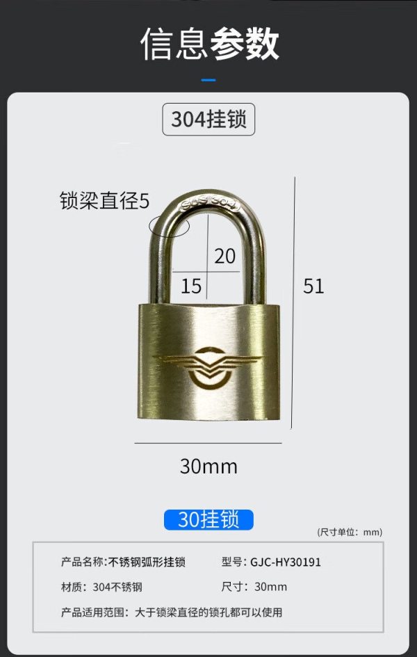 商品名称:华翼 GJC-HY30191 不锈钢弧形挂锁30mm 单位:个