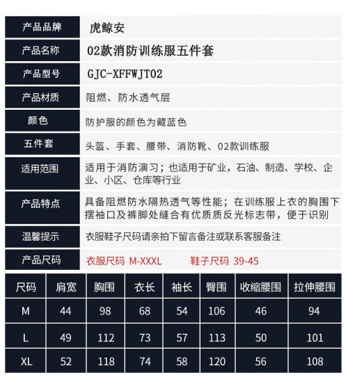 商品名称:虎鲸安 GJC-XFFWJT02 02款消防训练服五件套 单位:套