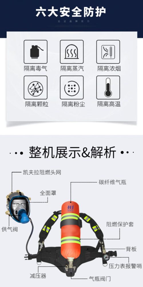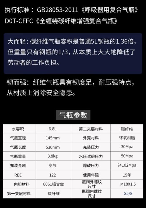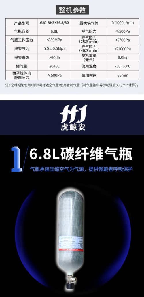 商品名称:虎鲸安 GJC-RHZKF6.8/30 正压式空气呼吸器一套 6.8L碳纤维气瓶整套