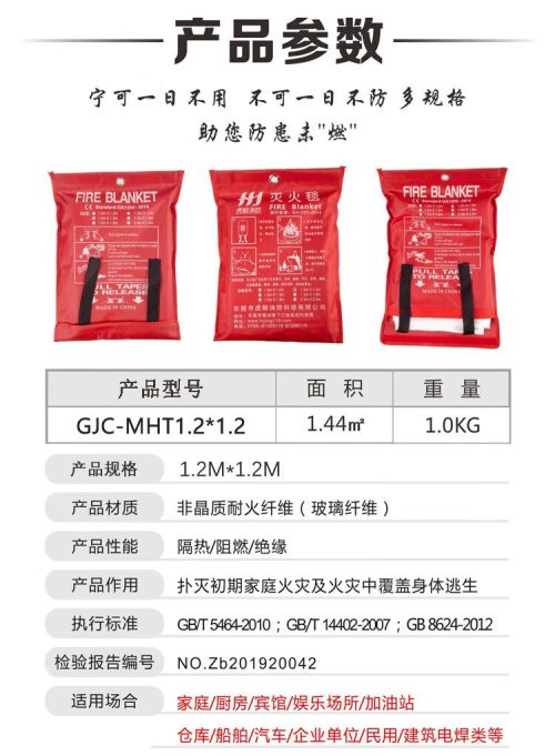 商品名称:虎鲸安 GJC-MHT1.2*1.2 灭火毯 1.2Mx1.2M 单位:张
