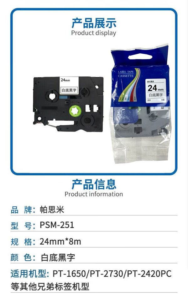商品名称:帕思米 PSM-251适用兄弟标签机色带标签纸 规格24mm*8m白底黑字