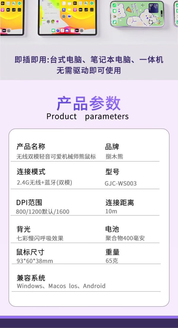 商品名称:捌木熊GJC-WS003无线双模轻音可爱机械师熊鼠标(单位:个)