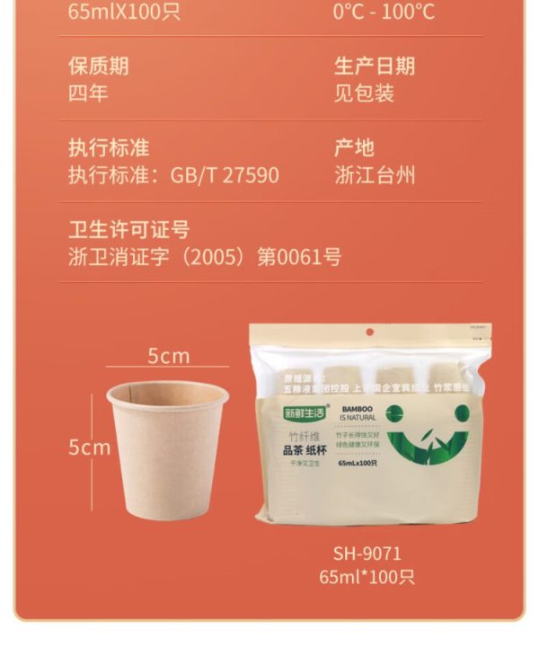 商品名称:新鲜生活 SH-9071 聚会家用品65mL*100只竹纤维 品茶 纸杯(单位:包)