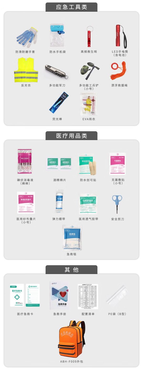 商品名称:爱备护 防汛应急包 ABH-GJC-F009G 含24种53件急救用品 单位:套