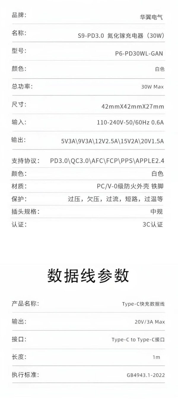 商品名称:华翼电气 P6-PD30WL-GAN 充电器套装 单位(套)