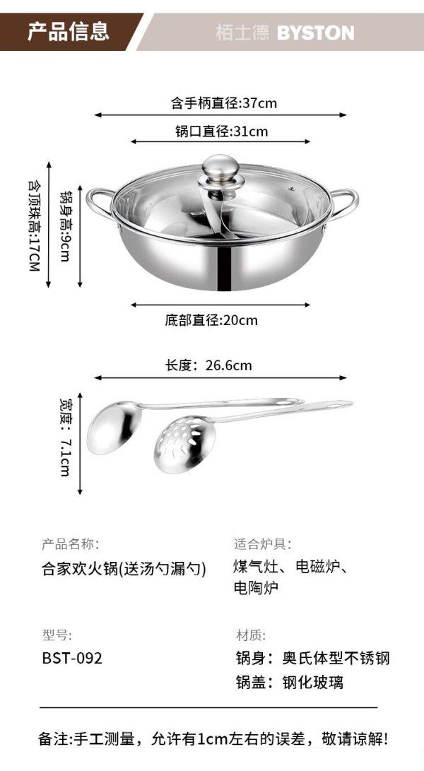 商品名称:栢士德(BYSTON) BST-092 合家欢火锅 30公分 (赠送汤勺漏勺) (计价单位:套)