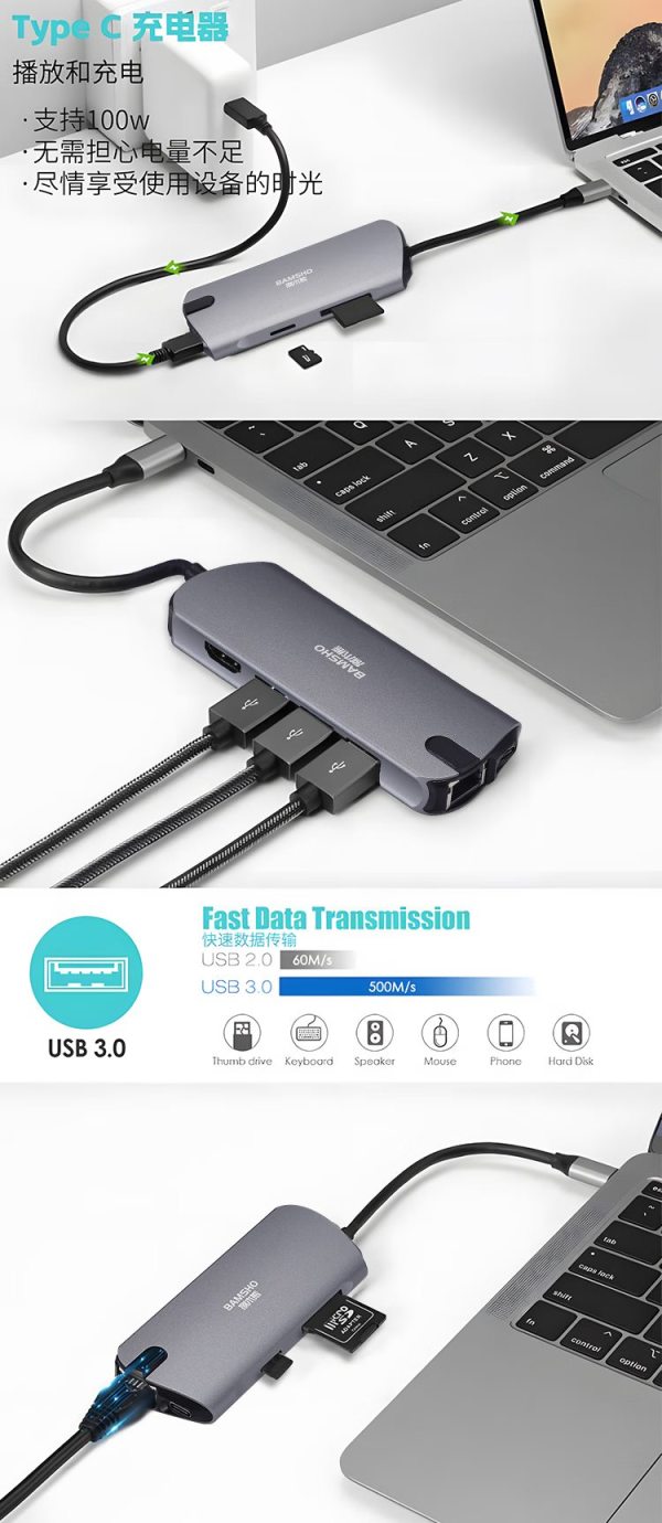 捌木熊 GJC-40016 扩展坞(集线器)8合一 100*45*10mm 银灰色 (单位:个)