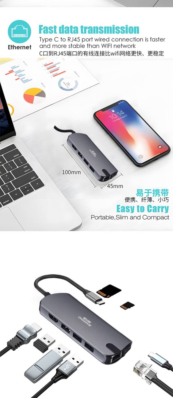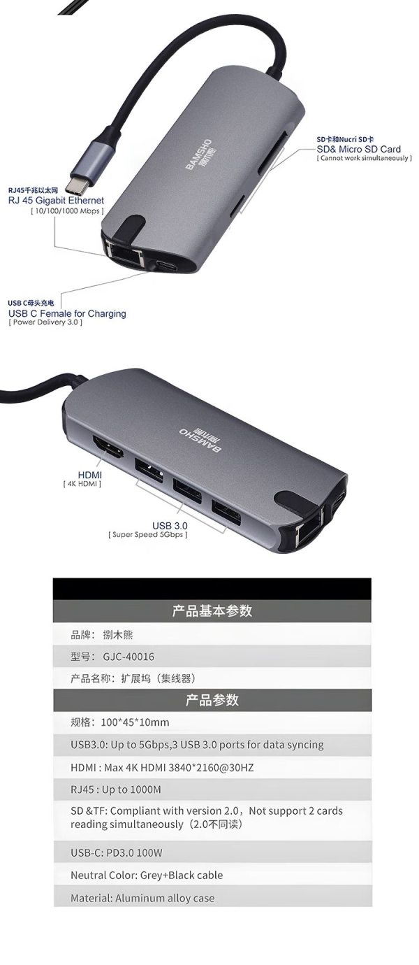 商品名称:捌木熊 GJC-40016 扩展坞(集线器)8合一 100*45*10mm 银灰色 (单位:个)