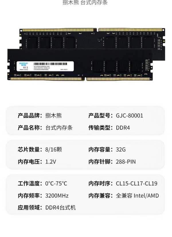 商品名称:捌木熊 GJC-80001 台式内存条 32G 3200MHz DDR4台式机 单位:条