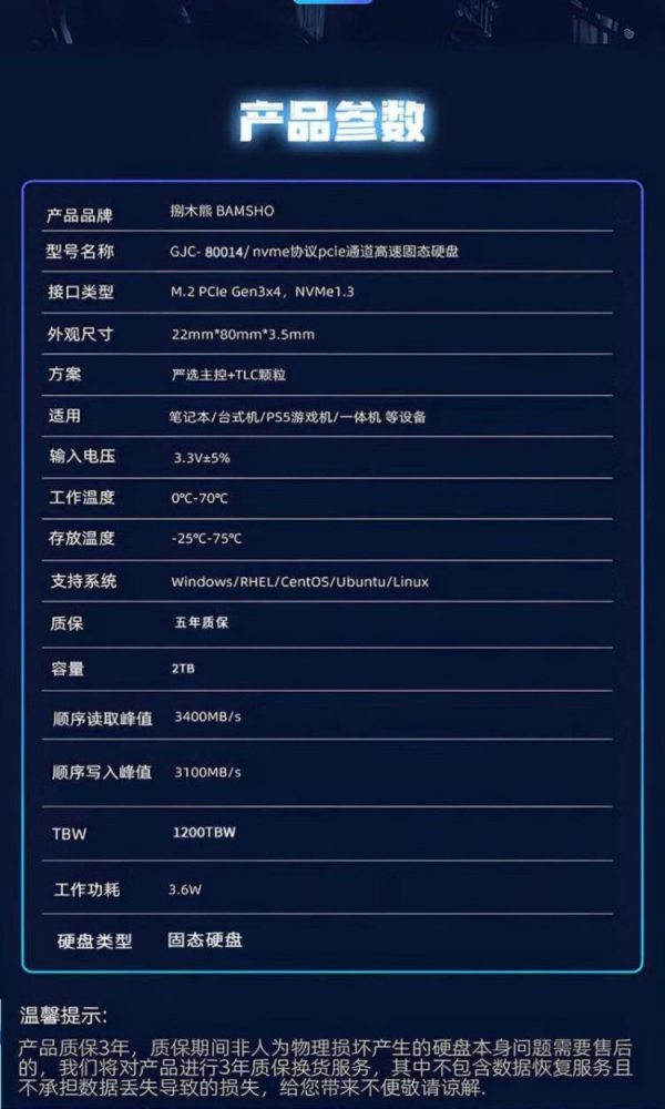 商品名称:捌木熊 GJC-80014 nvme协议pcie通道高速固态硬盘 2TB 单位(个)
