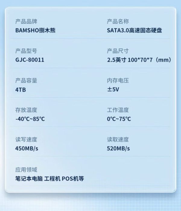 商品名称:捌木熊 GJC-80011 SATA3.0高速固态硬盘 4T 单位(个)