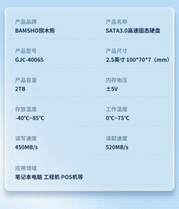 商品名称:捌木熊 GJC-40065 SATA3.0高速固态硬盘 2T 单位(个)
