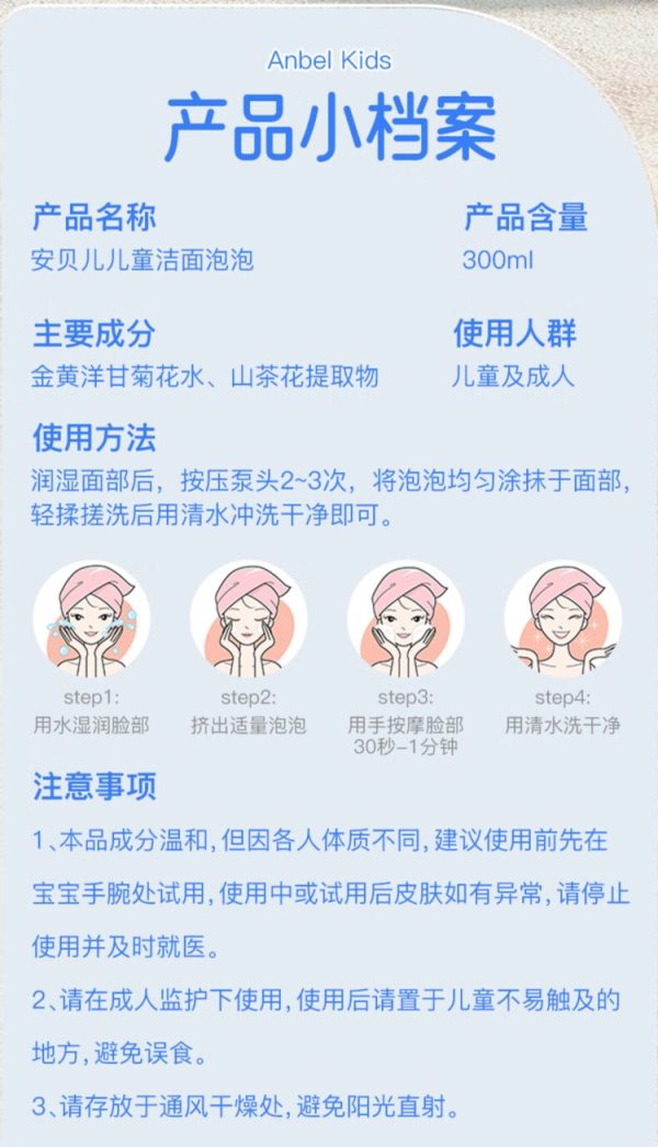 商品名称:安贝儿儿童洁面泡泡300ml (单位:瓶)