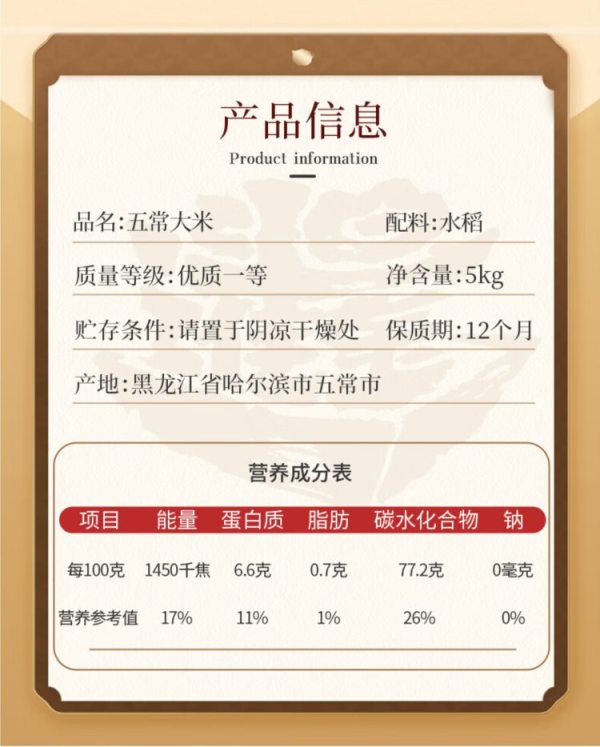 商品名称:裕道府(匠心系列)五常有机大米(双层袋真空装)5kg