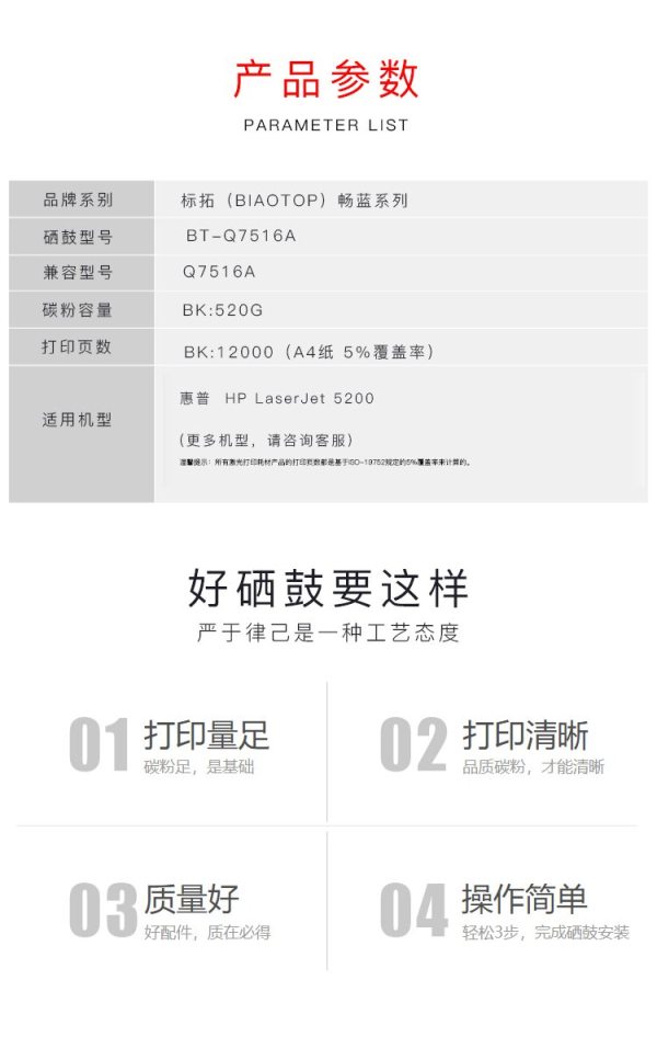 商品名称:标拓 BT-Q7516A 打印量12000页 适用惠普HP LaserJet 5200 硒鼓 黑色 (计价单位:支)