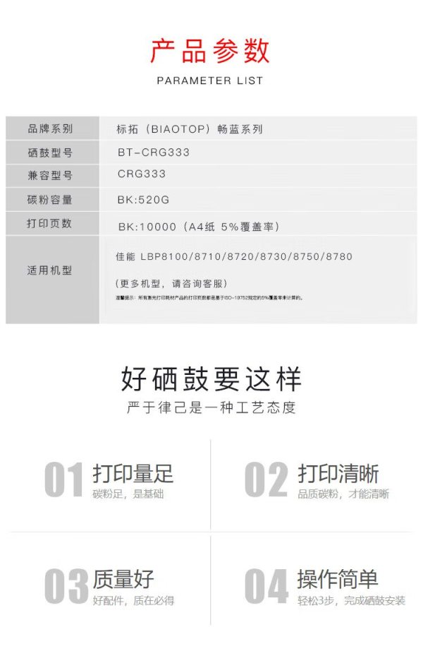商品名称:标拓 BT-CRG333 打印量10000页 适用佳能LBP8100/8710/8720/8730/8750/8780 硒鼓 黑色 (计价单位:支)