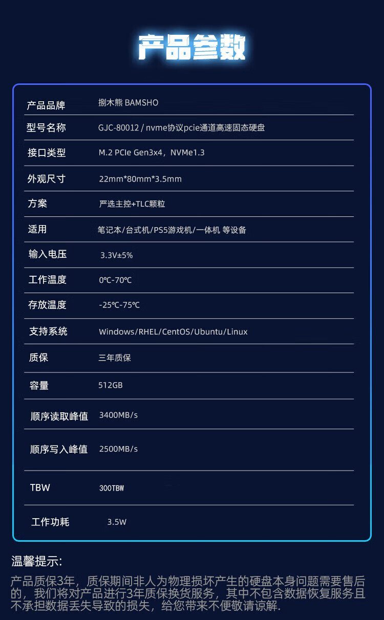 商品名称:捌木熊 GJC-80012 nvme协议pcie通道高速固态硬盘 512G 单位(个)