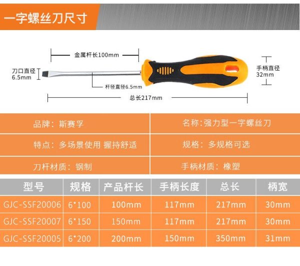 商品名称:斯赛孚 GJC-SSF20007 一字螺丝刀螺丝批起子 规格6*150 单位:把