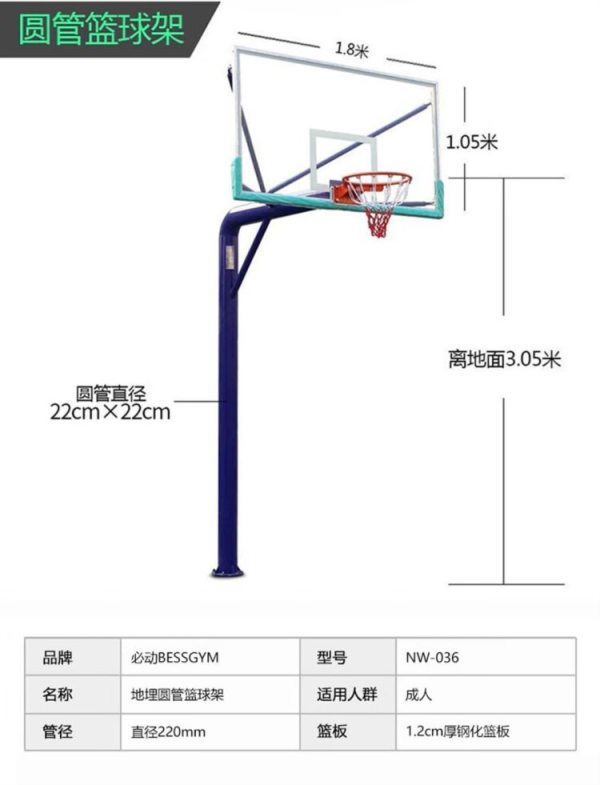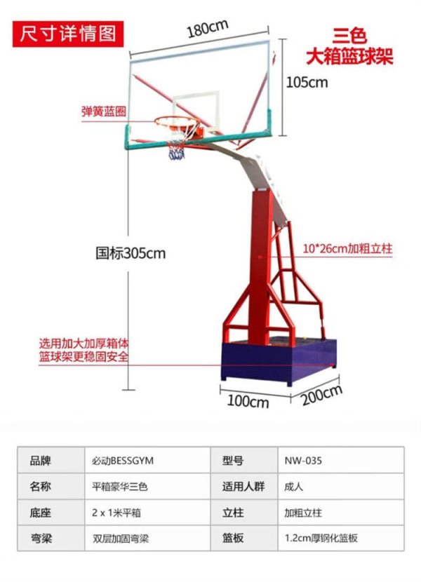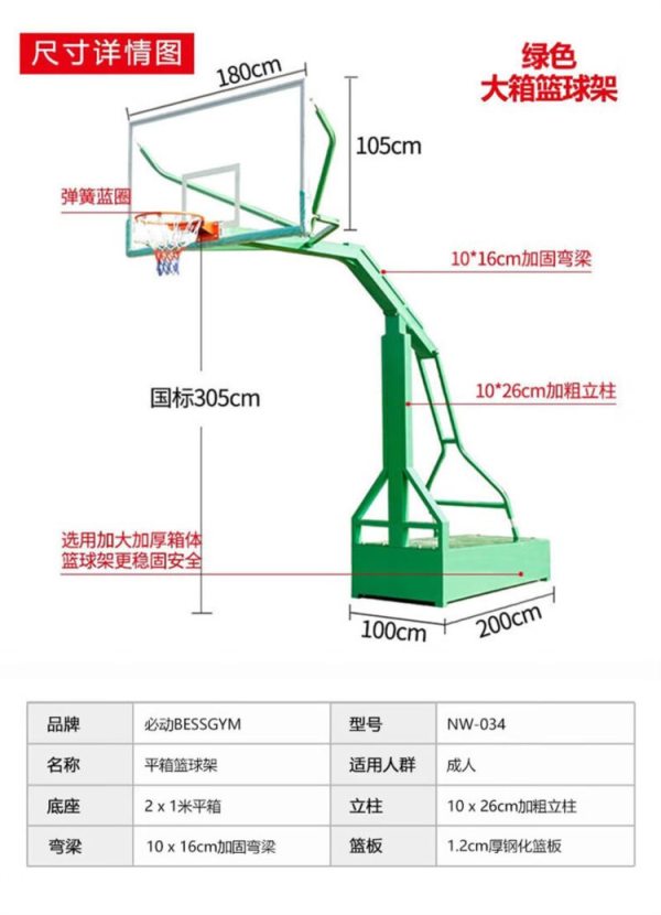 商品名称:必动(BESSGYM) NW-033 篮板尺寸:1.8*1.05m 底座尺寸:1.0*2.0m 凹箱加强款篮球架 (计价单位:台)