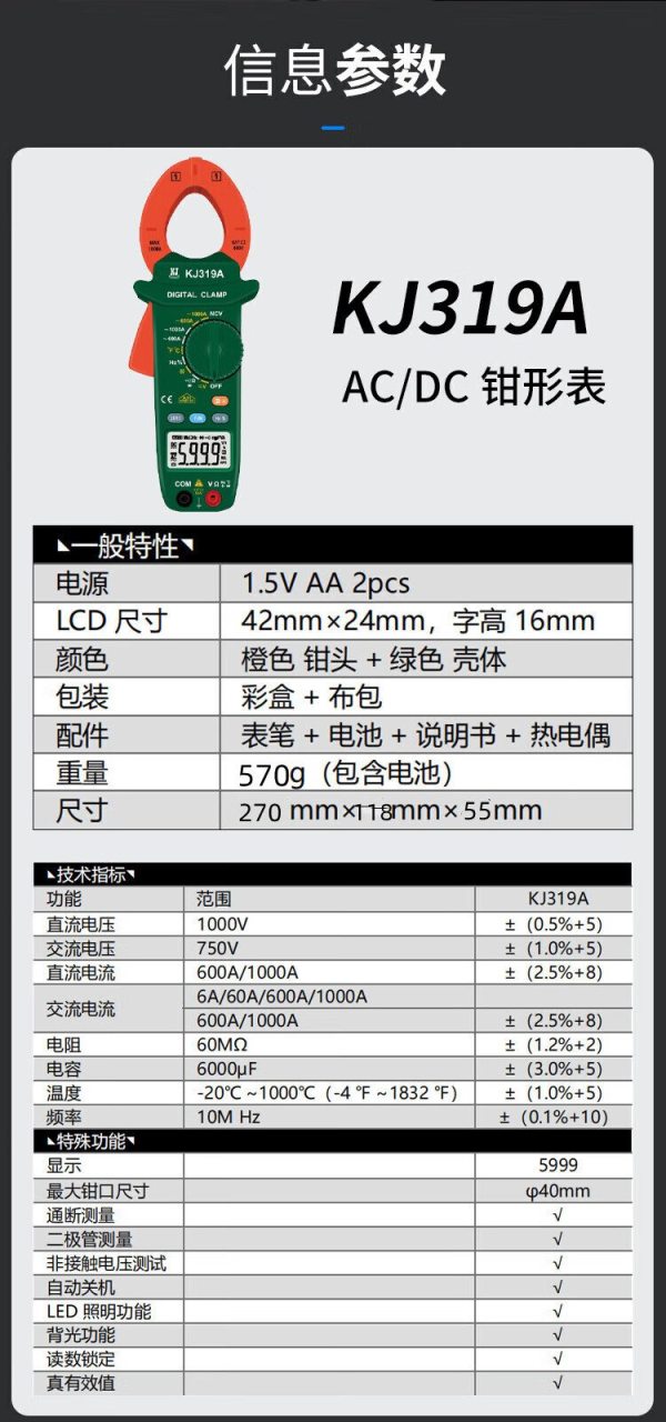 商品名称:科捷(KJ) KJ319A 直流电压:1000V 万用表 (计价单位:台)