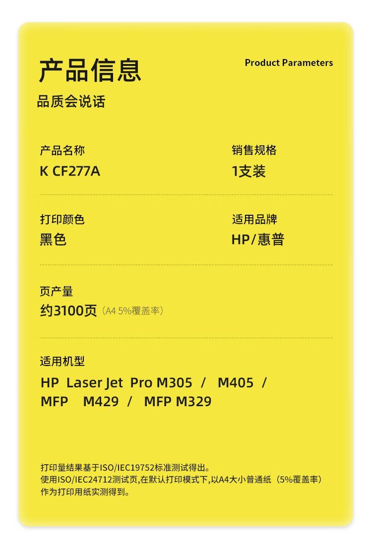 商品名称:科思特(KST) CF277A专业版带芯片 3100页 适用惠普 M305d M405d M405dn/dw M329dw M429dw 硒鼓 黑色 (计价单位:个)