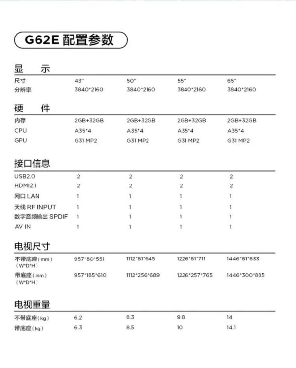 商品名称:TCL 55G62E 55英寸2+32GB 电视 (计价单位:台)