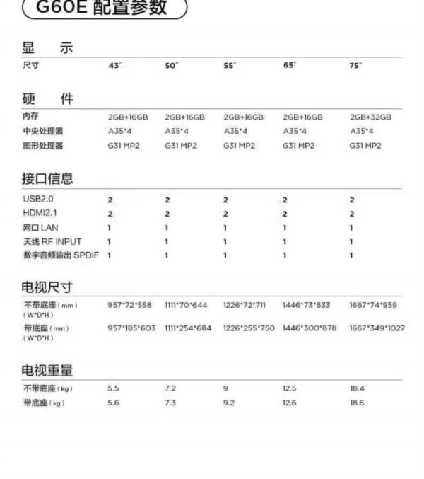 商品名称:TCL 75G60E 75英寸 2+16GB 电视 (计价单位:台)